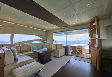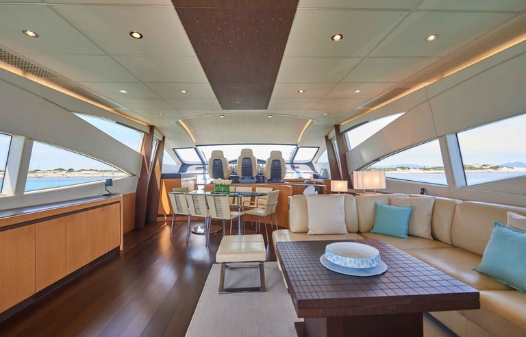 A bordo de la Pershing 90, los límites entre el interior y el exterior desaparecen. Su salón principal cuenta con un sistema de puertas acristaladas que se ocultan por completo, creando un espacio diáfano único que conecta la sofisticación del diseño italiano con la brisa marina.