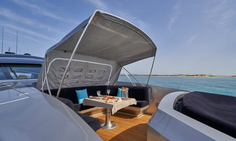 Solarium Privado: Disfruta del sol en sus amplias colchonetas de proa o en el exclusivo flybridge.